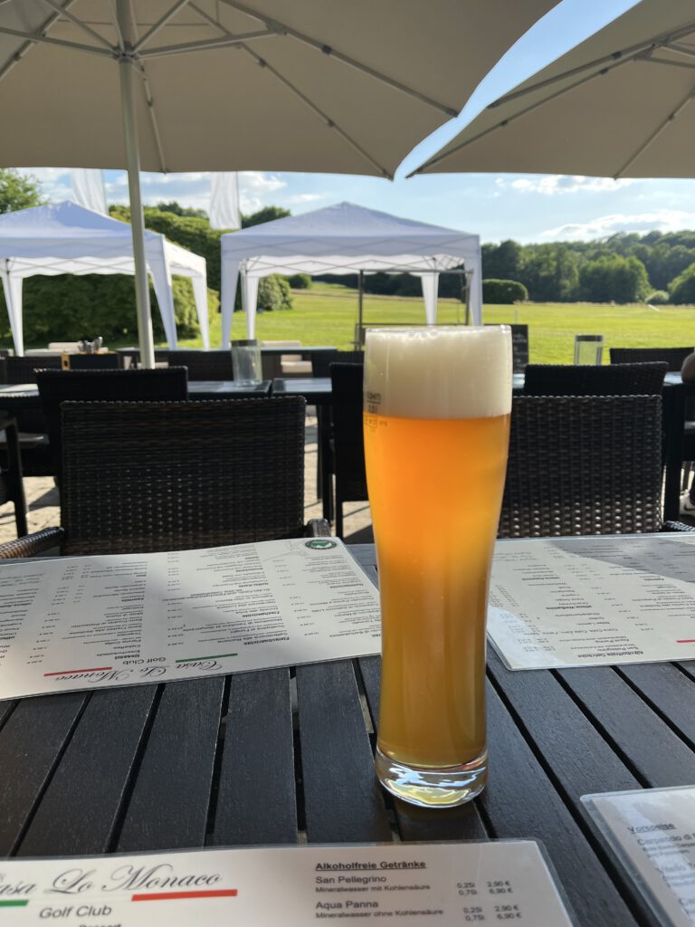 Nach dem Spiel habe ich mich zur Stärkung wie immer auf ein alkoholfreies Weizen im Clubhaus eingefunden. Die Terrasse liegt sehr schön mit Blick auf die Bahnen 13 und 18. Insgesamt war das ein rundum entspannter Besuch in Wuppertal; ich komme bei Gelegenheit gerne wieder.